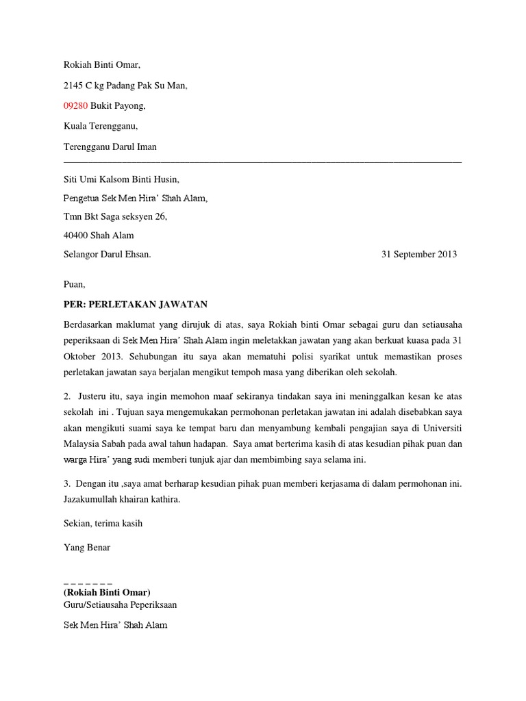 Doc Surat Berhenti Kerja Dan Juga Perletakan Jawatan Hazimah Isa Academia Edu